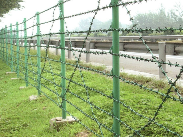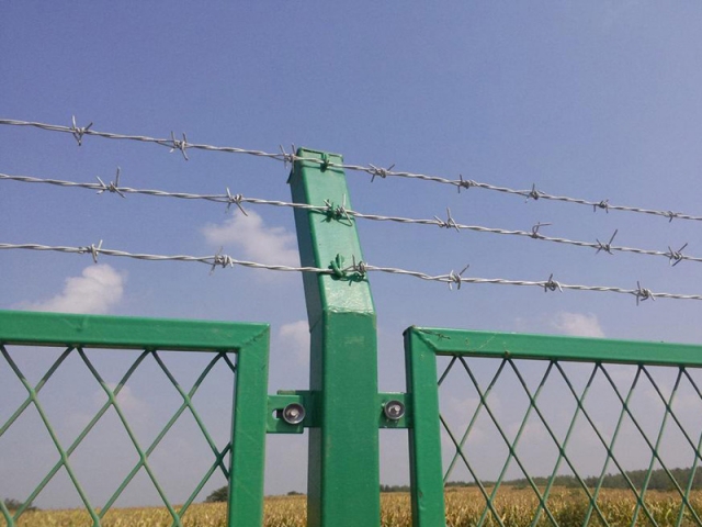 刺鐵絲柵欄是帶刺的鐵絲連接而成的防護隔離柵欄,刺鋼絲是低碳鋼絲經(jīng)過轉(zhuǎn)輪機編織旋轉(zhuǎn)而成單股或者雙股的帶刺鋼絲,刺鋼絲的表面處理方式分為:熱鍍鋅、電鍍鋅、熱浸塑三種方式。